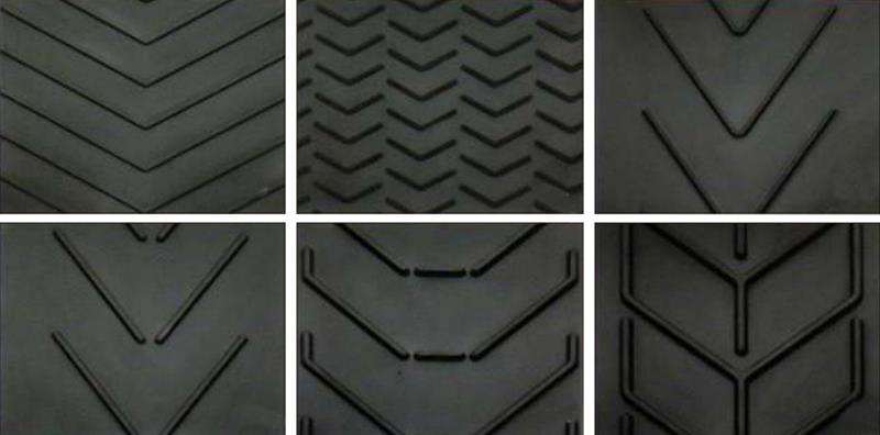 花紋輸送帶由帶體和花紋件組成。根據輸送長度和工作強度的要求,帶體可由分層狀織物芯或鋼絲繩芯骨架材料進行組成。根據輸送物料的不同大小和輸送機角度的不同,對花紋形狀和高度的要求也不同,每種花紋可分為高、低三種,花紋間距也分為稀疏、密集兩種形式。